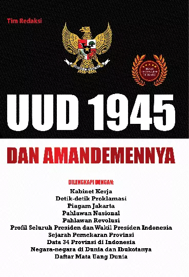 Sinopsis Singkat Buku ini: Buku ini memberikan gambaran menyeluruh tentang Undang-Undang Dasar Negara Republik Indonesia Tahun 1945, termasuk amandemen yang telah diterapkan, yaitu Amandemen I, II, III, dan IV. Buku ini menjelaskan secara sistematis dan terstruktur tentang pembukaan UUD 1945, yang menjadi dasar filosofi dan prinsip dasar negara Indonesia. Selain itu, buku ini juga membahas penjelasan tentang tata cara pemilihan dan jabatan Presiden serta Wakil Presiden, serta prosedur pemberhentian jabatan mereka berdasarkan UUD 1945. Buku ini juga menyajikan informasi tentang kabinet Kerja, sejarah pemekaran provinsi, dan data 34 provinsi di Indonesia, yang memberikan wawasan tentang struktur pemerintahan dan pembagian wilayah negara. Selain itu, buku ini juga menyertakan daftar negara-negara di dunia beserta ibukotanya, serta daftar mata uang dunia, yang memperkaya pemahaman pembaca tentang konteks internasional. Buku ini merupakan sumber informasi yang relevan dan penting bagi pelajar, mahasiswa, dan masyarakat umum yang ingin memahami secara mendalam tentang sistem pemerintahan, sejarah, dan struktur negara Indonesia, serta konteks globalnya.