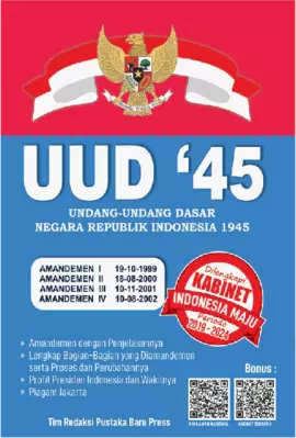 Sinopsis Buku: Buku ini menyajikan secara lengkap dan terstruktur Undang-Undang Dasar Negara Republik Indonesia Tahun 1945 (UUD 1945), termasuk naskah asli sebelum dilakukan amandemen, proses amandemen, bagian-bagian yang mengalami perubahan, serta UUD 1945 setelah amandemen. Buku ini juga mencakup penjelasan tentang amandemen pertama hingga keempat yang telah disahkan pada sidang tahunan MPR-RI tahun 2002. Selain itu, buku ini dilengkapi dengan Susunan Kabinet terbaru, serta informasi tentang lambang negara dan Pancasila sebagai dasar negara. Buku ini merupakan sumber referensi yang sangat bermanfaat bagi para pelajar, mahasiswa, dan masyarakat umum yang ingin memahami secara mendalam sejarah, struktur, dan perkembangan UUD 1945 sebagai fondasi dari sistem pemerintahan Republik Indonesia.