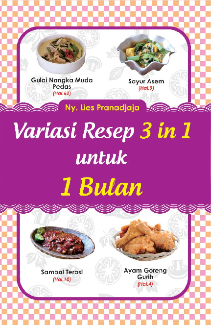 Sinopsis Buku Variasi Resep 3 in 1 untuk 1 Bulan Buku ini merupakan panduan praktis dan kreatif bagi para ibu rumah tangga dalam menyusun menu masakan sehari-hari yang bervariasi, mudah, dan terjangkau. Dengan 92 resep yang disusun secara terstruktur, buku ini memberikan solusi bagi Anda yang sering kesulitan memilih menu masakan untuk keluarga. Setiap hari dalam sebulan disajikan resep yang beragam, mulai dari masakan berbahan dasar ikan, daging, sayuran, hingga olahan tahu dan tempe yang lezat. Buku ini juga menyertakan berbagai variasi sambal dan bumbu khas, seperti sambal jahe, sambal cabai hijau goreng, serta sambal matah Bali, yang membuat setiap hidangan terasa lebih spesial. Semua resep dalam buku ini menggunakan bahan-bahan yang mudah diperoleh dan proses masak yang sederhana, sehingga cocok untuk pemula maupun penggemar masakan rumahan. Dengan buku ini, Anda dapat menikmati keberagaman masakan sehari-hari tanpa kesulitan dalam menentukan menu, sekaligus menjaga keharmonisan dan kesejahteraan keluarga.