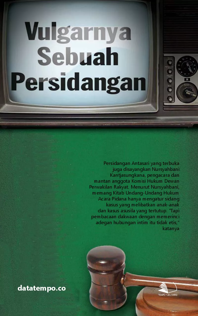 Persidangan Antasari yang terbuka juga disayangkan Nursyahbani Kantjasungkana pengacara dan mantan anggota Komisi Hukum Dewan Perwakilan Rakyat Menurut Nursyahbani memang Kitab Undang Undang Hukum Acara Pidana hanya mengatur sidang kasus yang melibatkan anak anak dan kasus asusila yang tertutup Tapi pembacaan dakwaan dengan memerinci adegan hubungan intim itu tidak etis katanya