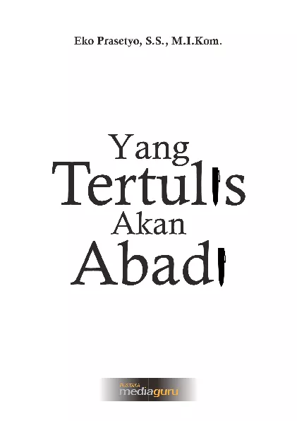 Musim semi literasi ditunjukkan lewat banyaknya karya buku dari kalangan pendidik Hal ini tentu saja mendukung iklim gerakan literasi sekolah yang dicanangkan pemerintah Salah satu yang aktif dalam peningkatan budaya literasi membaca dan menulis di tanah air adalah Eko Prasetyo Tak hanya memberikan motivasi dan mendorong para guru maupun siswa untuk berani berkarya dia juga tampil di garda depan dalam berkarya Buku ini merupakan catatan perjalanannya tentang filosofi menulis Bahwa yang terucap itu akan lenyap dan yang tertulis akan abadi
